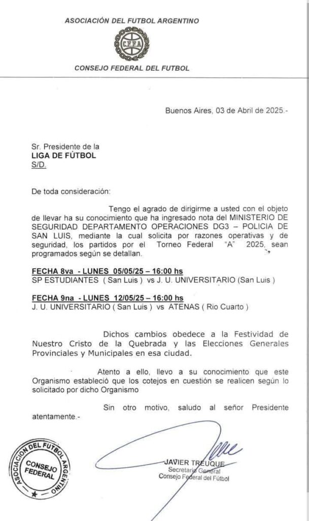 El esperado clásico del Torneo Federal A entre Estudiantes de San Luis y Juventud Unida Universitario ha sido reprogramado para el lunes 5 de mayo a las 16:00 en el estadio Juan Gilberto Funes de La Punta. El cambio, solicitado por la ministra de Seguridad Nancy Sosa, generó fuerte malestar entre hinchas, ya que originalmente el partido iba a disputarse el domingo.