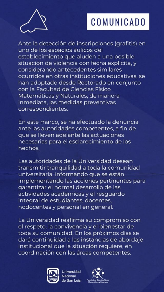 La Universidad Nacional de San Luis emitió un comunicado oficial tras la detección de inscripciones (grafitis) en un aula que hacen referencia a una posible situación de violencia con fecha explícita.