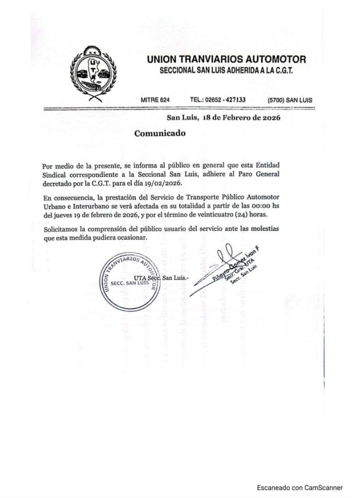 En un comunicado firmado por el secretario general de la UTA San Luis, Iván Piñeyro, el sindicato solicitó “la comprensión del público usuario ante las molestias que esta medida pudiera ocasionar”.