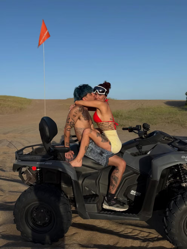 La pareja se mostró unida en una serie de postales que reflejaron su escapada romántica en la costa atlántica argentina. En las imágenes más celebradas, ambos aparecen juntos en la playa y las dunas besándose a través de la ventanilla de un todoterreno gris, posando sonriendo sobre un cuatriciclo negro y lucieron atuendos frescos para el calor.