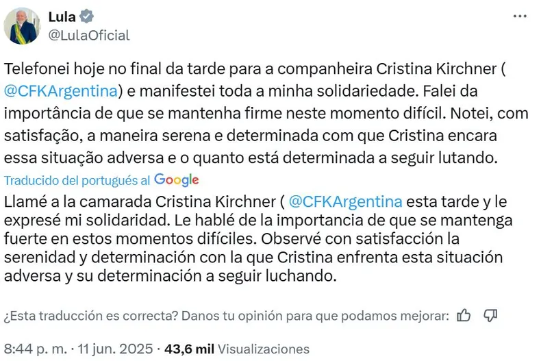 Tras la resolución de la Corte Suprema de Justicia de Argentina que confirmó la condena a seis años de prisión e inhabilitación perpetua para cargos públicos a Cristina Kirchner, Lula da Silva publicó un mensaje de respaldo en sus redes sociales.