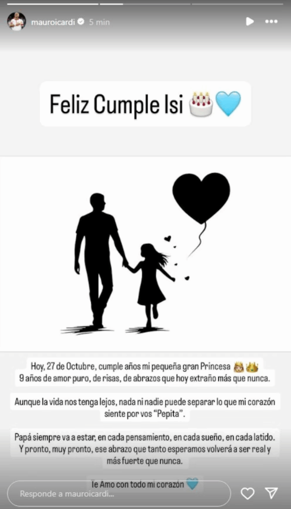 El delantero, radicado en Turquía, utilizó sus historias de Instagram para expresarle a Isabella todo su cariño y añoranza. “¡Feliz cumple Isi!… 9 años de amor puro, de risas, de abrazos que hoy extraño más que nunca. Aunque la vida nos tenga lejos, nada ni nadie puede separar lo que siento por vos ‘Pepita’. Papá siempre va a estar, en cada pensamiento, en cada sueño, en cada latido”, escribió.