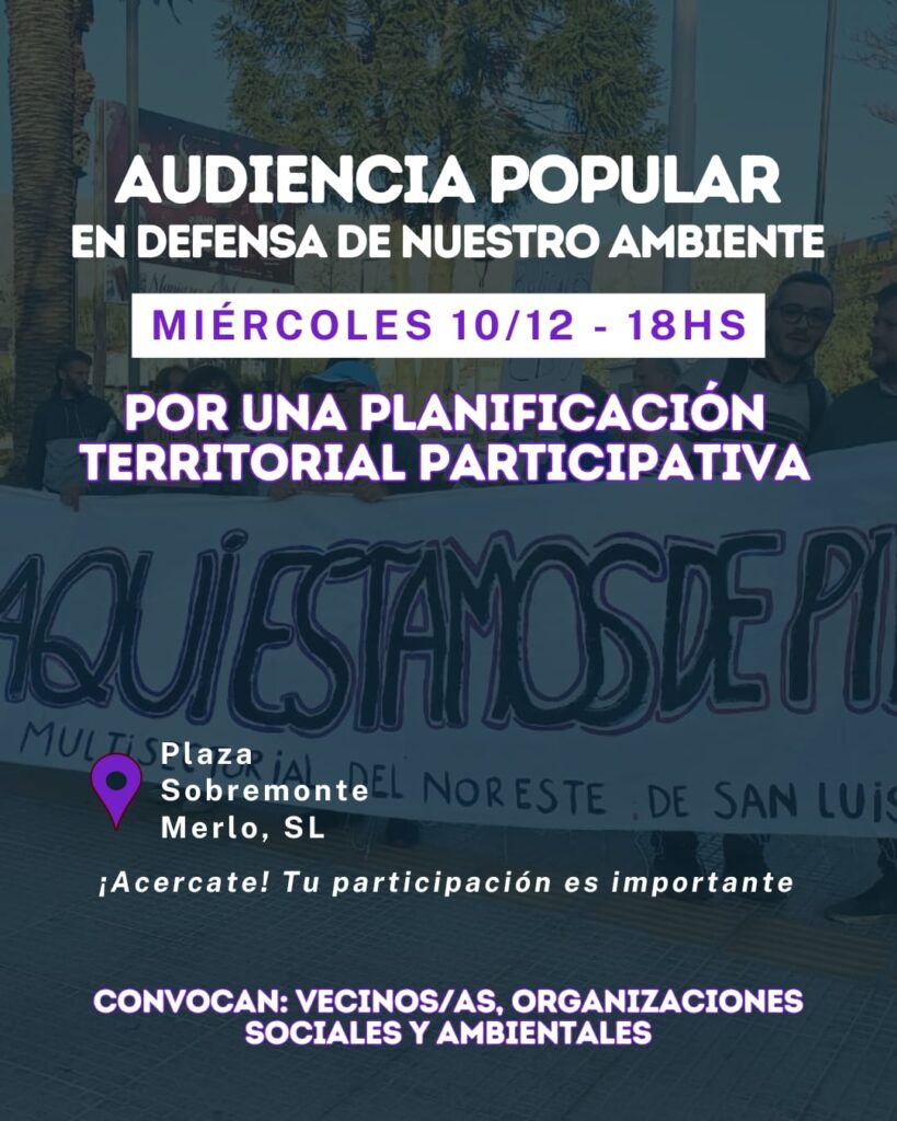 Vecinos, organizaciones sociales y colectivos ambientales de Villa de Merlo convocan a una audiencia popular este miércoles a las 18.00 en la Plaza Sobremonte. El objetivo es expresar inquietudes sobre la gestión del territorio y defender el derecho a participar en cada decisión que afecta el ambiente local.