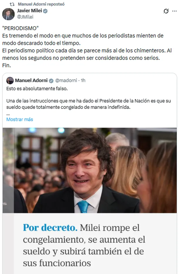 Minutos después del descargo oficial, Javier Milei utilizó su cuenta en X para expresar su malestar. En un mensaje breve pero contundente, cuestionó el accionar de algunos sectores del periodismo político.