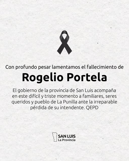 El Gobierno de San Luis expresó sus condolencias a través de un comunicado en redes sociales: “El gobierno de la provincia acompaña en este difícil y triste momento a familiares, seres queridos y pueblo de La Punilla ante la irreparable pérdida de su intendente, Rogelio Portela. QEPD”.