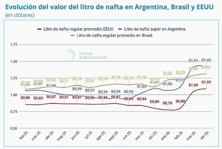 En términos comparativos, el litro de nafta en Argentina se ubica en torno a 1,42 dólares, por encima de Estados Unidos, donde el promedio es de 1,09 dólares, y también superior al de Brasil, con 1,29 dólares.