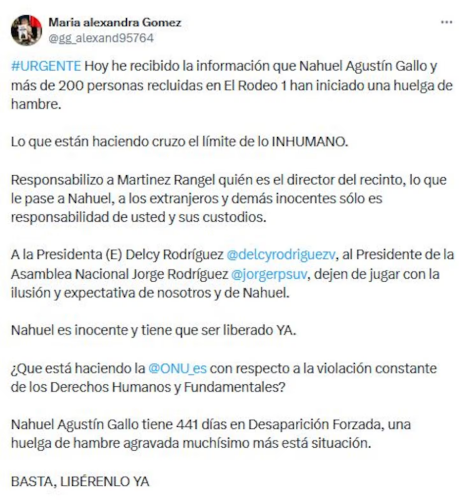 El agente catamarqueño Nahuel Gallo, recluido en la cárcel El Rodeo I en Caracas, advirtió que mantendrá su huelga de hambre hasta recibir asistencia consular y la visita de la Cruz Roja Internacional. La exigencia fue transmitida por su pareja, María Alexandra Gómez, quien aseguró que fue comunicada a través de otros familiares de reclusos tras una visita a los presos.