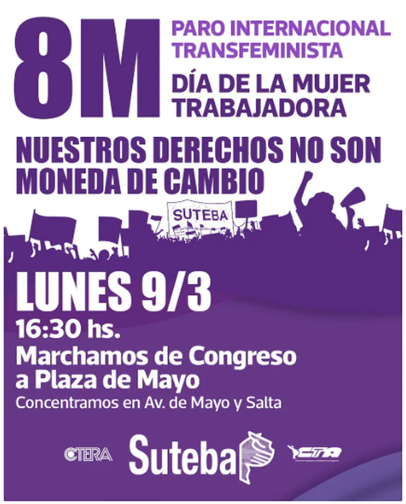 El feminismo enfrenta una jornada de lucha este lunes en conmemoración del Día Internacional de la Mujer Trabajadora. Mujeres de todo el país se pliegan a un paro internacional y, en la Ciudad de Buenos Aires, y se movilizaron esta tarde por el centro porteño. Diversas organizaciones sindicales y sociales convocaron a concentrarse desde las 16:30 en la intersección de Avenida de Mayo y Salta.