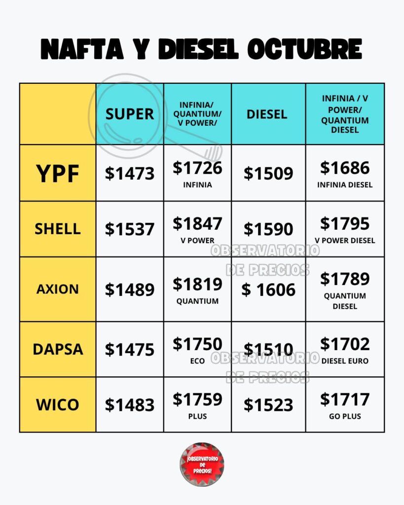 El diésel común también presenta variaciones: YPF lo comercializa a $1509, Dapsa a $1510, y Wico a $1523, mientras que Shell alcanza los $1590.