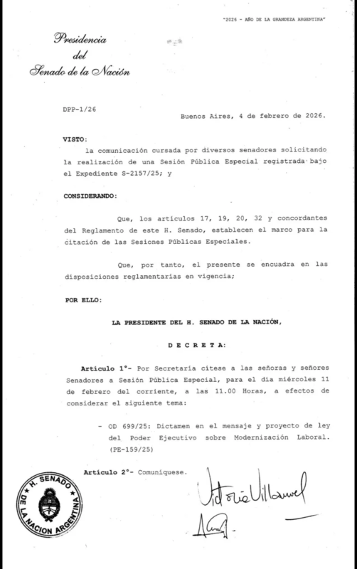 «Por Secretaria cítese a las señoras y señores Senadores a Sesión Pública Especial, para el dia miércoles 11 de febrero del corriente, las 11.00 Horas, considerar el siguiente tema: a los efectos de OD 699/25: Dictamen en el mensaje y proyecto de ley del Poder Ejecutivo sobre Modernización Laboral. (PE-159/25)», señala el artículo 1 de la circular que lleva la firma de la vicepresidenta Victoria Villarruel.