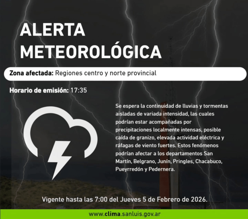 Las condiciones climáticas adversas podrían impactar en los departamentos San Martín, Belgrano, Junín, Pringles, Chacabuco, Pueyrredón y Pedernera.