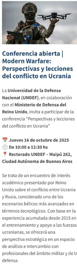 La charla, titulada «Perspectivas y lecciones del conflicto en Ucrania», busca analizar «uno de los conflictos bélicos más avanzados en términos tecnológicos». Sin embargo, esta actividad no se difundió por redes sociales; solo se notificó a través de un mail interno para los docentes. Un militar en actividad aseguró que el gobierno «no se animó a difundirla públicamente».