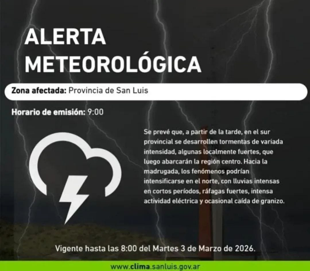 La Red de Estaciones Meteorológicas (REM) informó que rige una alerta meteorológica por fuertes tormentas para la provincia de San Luis. Las condiciones climáticas estarán vigentes hasta las 8:00 del martes 3 de marzo.