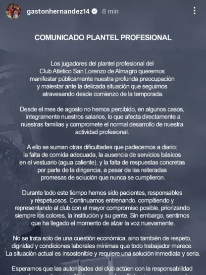 Los futbolistas de San Lorenzo expusieron la crisis que atraviesa la institución. A través de un comunicado que difundió el capitán Gastón Hernández, el plantel reclamó el pago de salarios atrasados y mejores condiciones laborales.