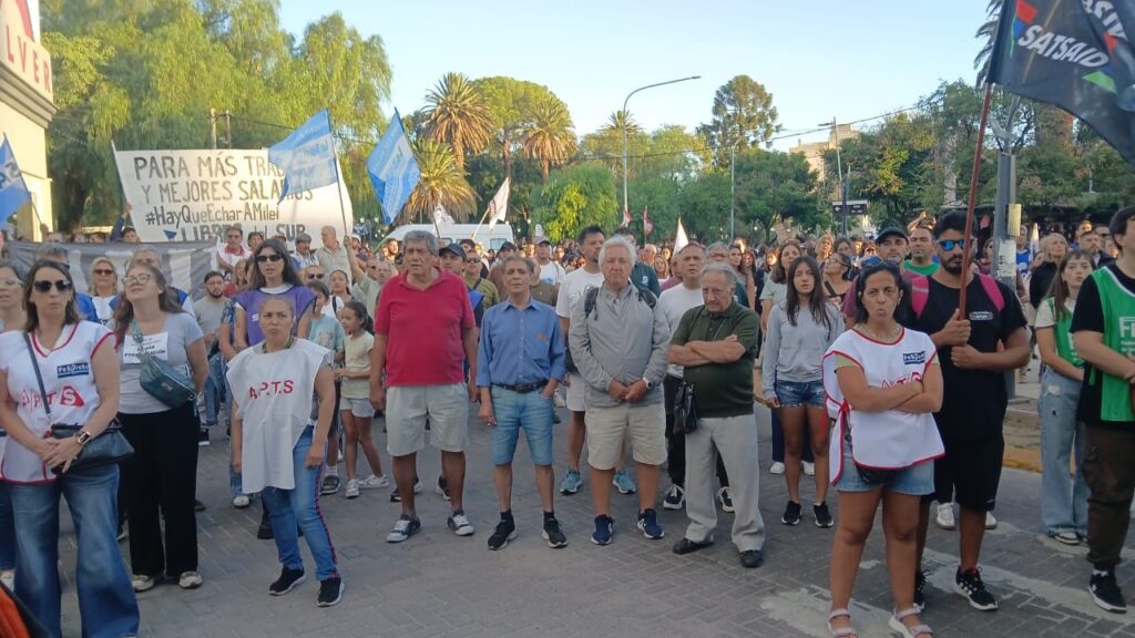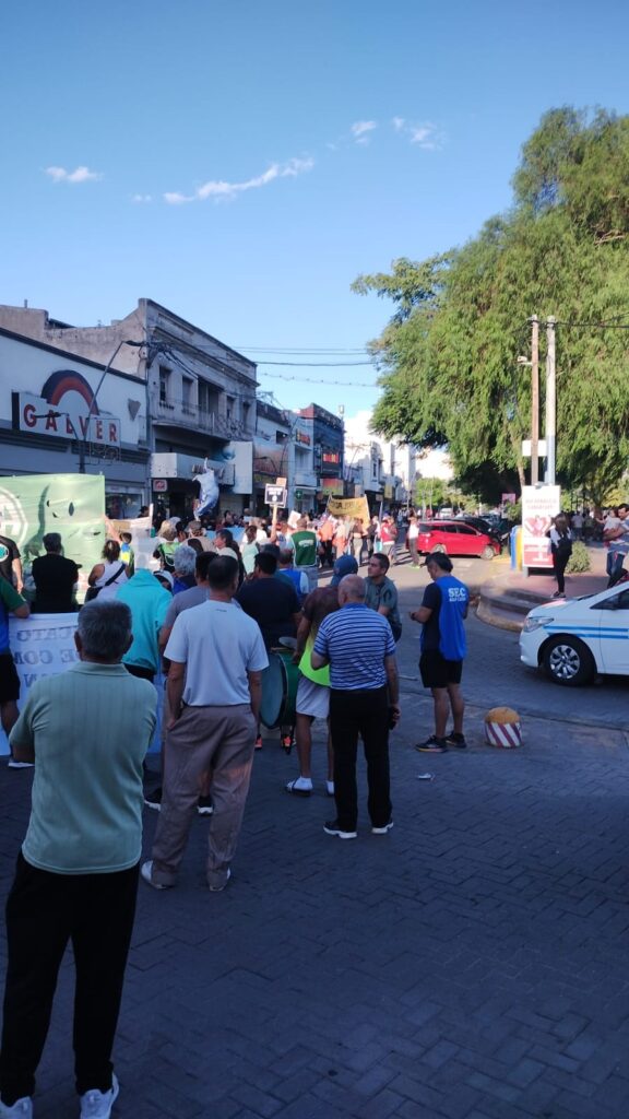 La concentración inició pasadas las 18 en la esquina de San Martín y avenida Illia, donde los manifestantes entonaron el Himno Nacional. Luego, la columna recorrió las principales arterias con cánticos contra el presidente Javier Milei y legisladores oficialistas.