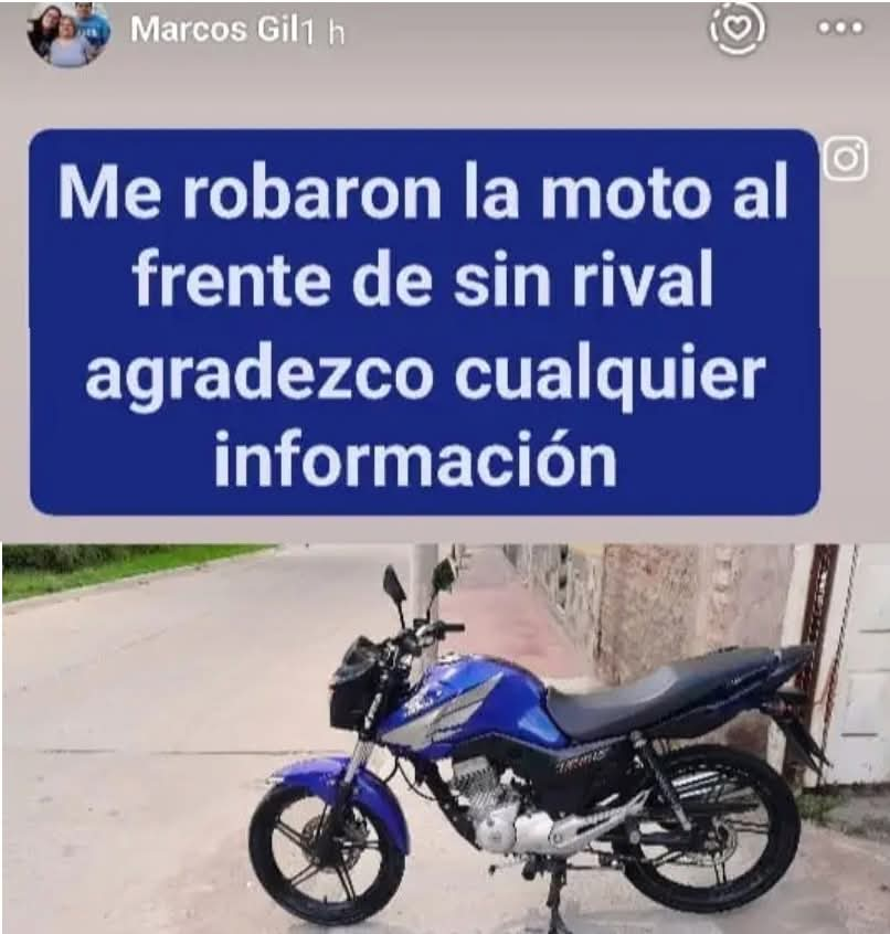 Se trata de una Honda Titán de 150 centímetros cúbicos, de color azul con negro. Según indicó el joven, nadie presenció el hecho y, hasta casi 24 horas después, no se había registrado ningún avance en la investigación. “Estoy con mucha bronca y tristeza; es como que se la tragó la tierra”, expresó Gil.
