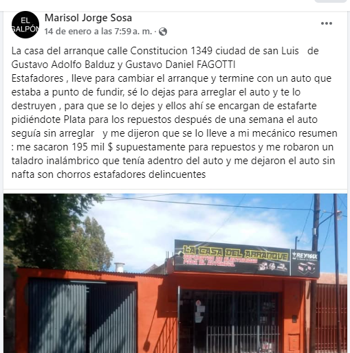 Marisol y Jorge, residentes de Estancia Grande, relataron una experiencia que podría calificarse como una presunta estafa tras llevar su vehículo al taller «La Casa del Arranque», ubicado en Constitución 1349, en la ciudad de San Luis.