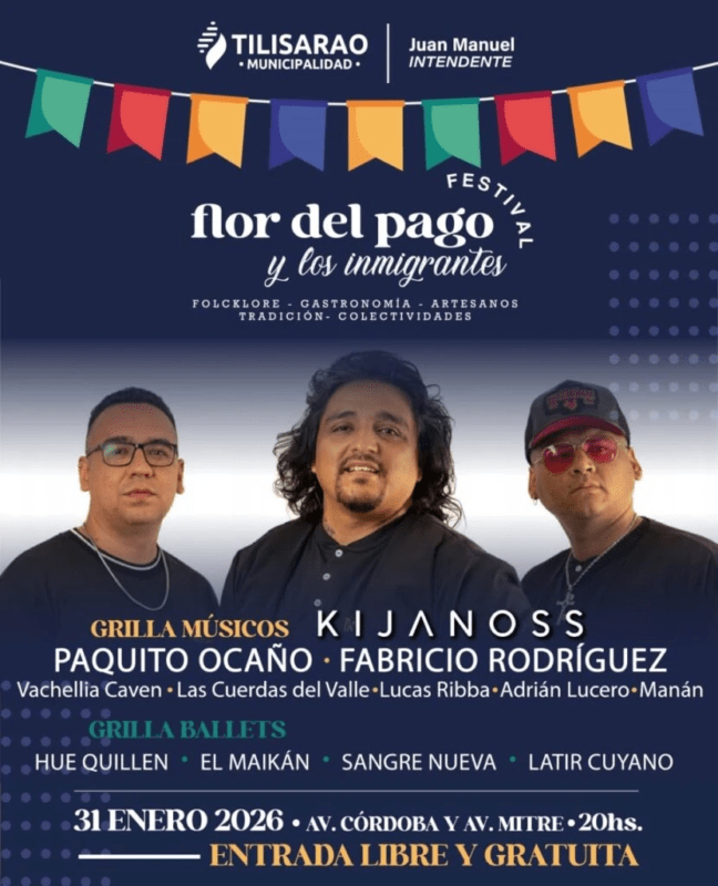 Tilisarao se prepara para una jornada de celebración este sábado. El tradicional Festival de la Flor del Pago y Los Inmigrantes se desarrollará frente al edificio municipal, desde las 20.00, en la intersección de las avenidas Córdoba y Santa Fe. Con entrada libre y gratuita, el evento promete reunir a vecinos y turistas en una de las citas más esperadas del calendario local.