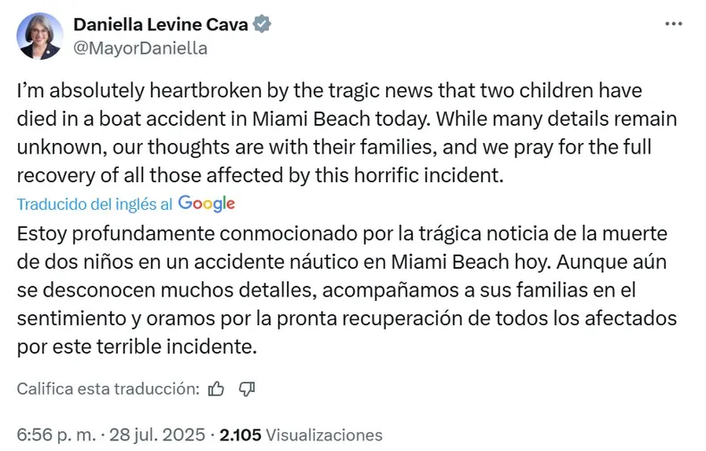 La tragedia generó una inmediata reacción de las autoridades. Daniella Levine Cava, alcaldesa de Miami-Dade, expresó su pesar: