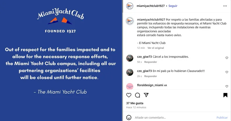 El Miami Yacht Club confirmó que el accidente involucró a integrantes de su programa juvenil y anunció el cierre temporal de sus instalaciones “por respeto a las familias y para facilitar las tareas de respuesta”.