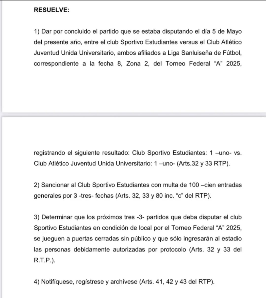 El Club Sportivo Estudiantes deberá pagar una multa equivalente al valor de 100 entradas generales y jugar sin público en sus próximos tres partidos como local, como consecuencia de los incidentes registrados en el clásico del lunes pasado frente a Juventud Unida Universitario, que terminó 1 a 1.