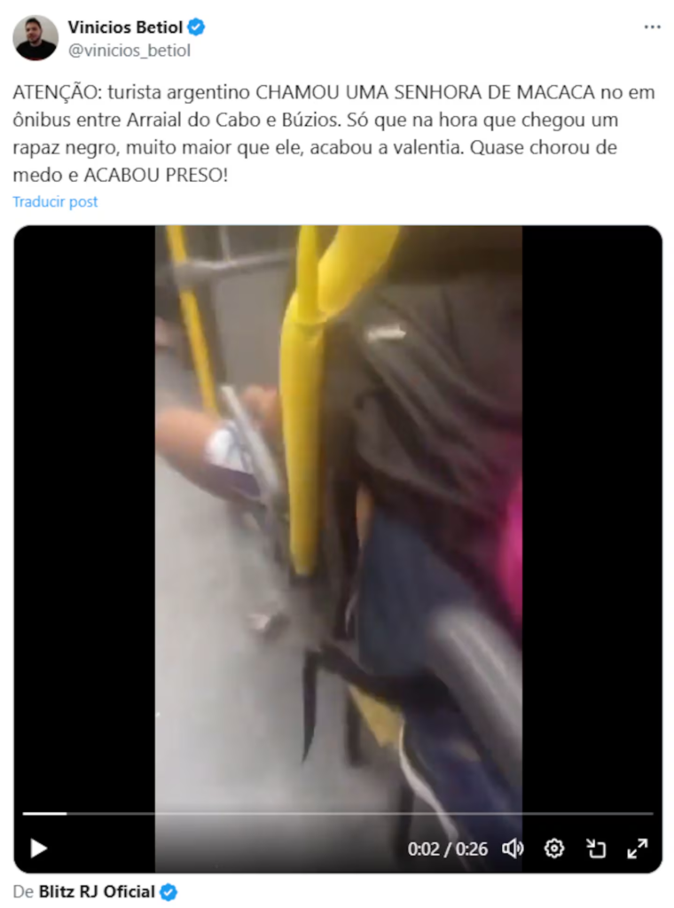 El video fue compartido en redes sociales y provocó indignación entre los usuarios. Un internauta escribió en X: “Turista argentino llamó mona a una señora en el autobús. Pero cuando llegó un niño negro, mucho más grande que él, su valentía terminó. ¡Casi lloró de miedo y terminó arrestado!”.