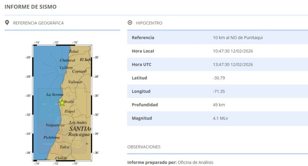 El Centro Sismológico Nacional de la Universidad de Chile ubicó el epicentro 13 kilómetros al oeste de Punitaqui, en la región de Coquimbo.