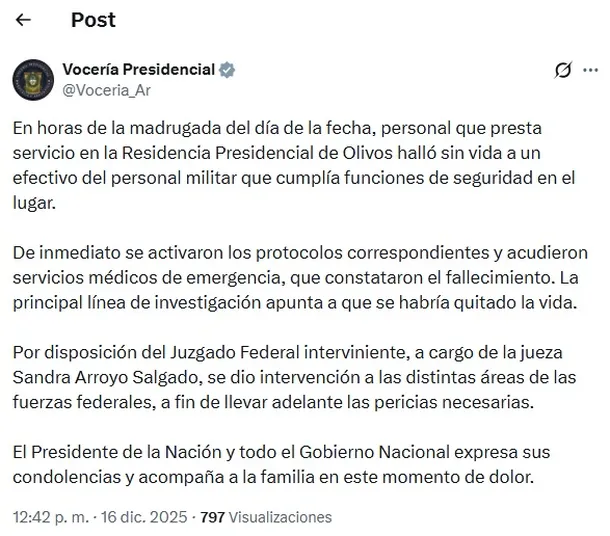 El posteo de Vocería Presidencial por la muerte de un soldado en la Quinta de Olivos