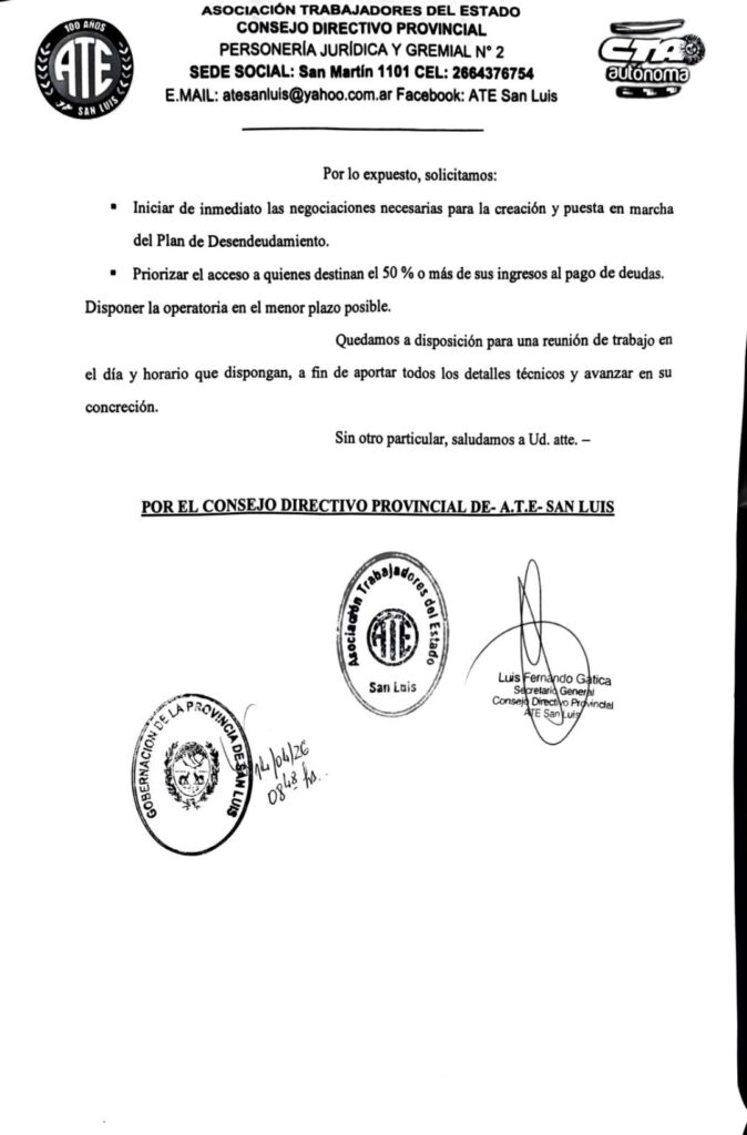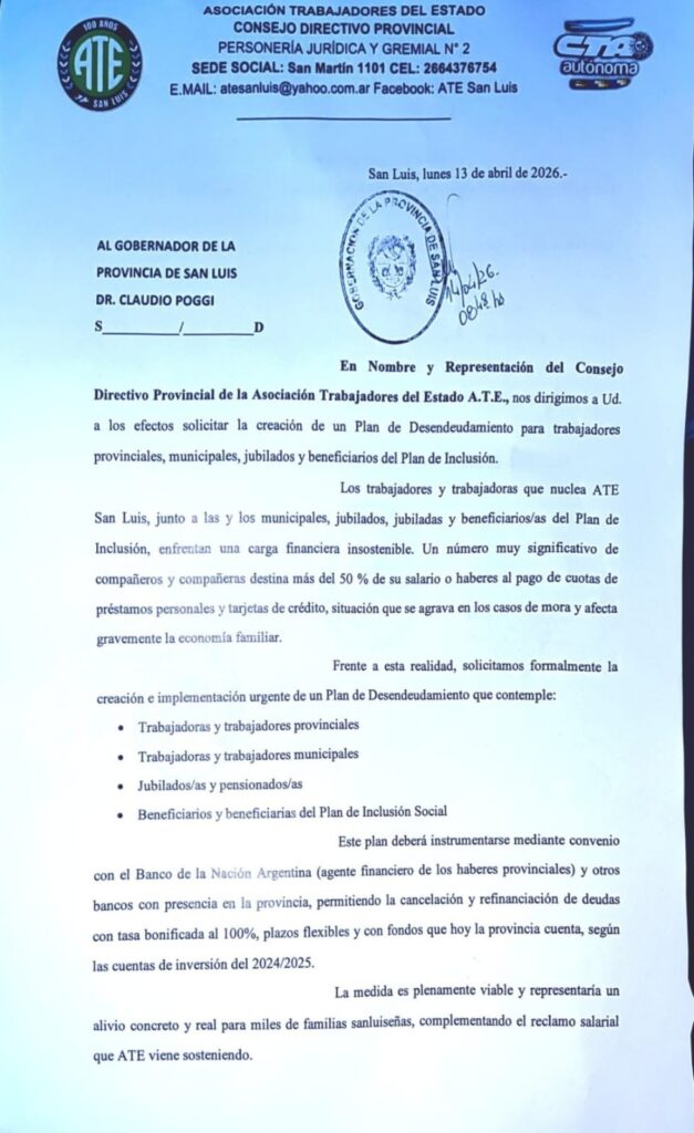 El Consejo Directivo Provincial de ATE pidió al gobernador Claudio Poggi que instrumente un plan de desendeudamiento para los trabajadores de la administración pública, mediante acuerdos con entidades bancarias que permitan reducir los intereses de las deudas contraídas.