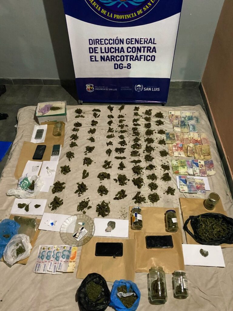 Los efectivos secuestraron 434 gramos de flores de marihuana y dos envoltorios de nylon con sustancia blanquecina similar a la cocaína, cuyo valor estimado asciende a $3.906.000. También se incautaron cinco teléfonos celulares, tres balanzas digitales, $384.169 y otros elementos de interés para la causa.