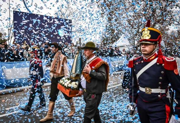 Pasadas las 11:00, ballets locales como IFAL, Rincón Nativo y Lucio V. Mansilla ofrecieron estampas folclóricas que abrieron el desfile con color, música y tradición. La Agrupación Gaucha El Corcovo encabezó la marcha, portando imágenes religiosas y escoltada por una sección del Regimiento de Granaderos a Caballo ‘General San Martín’.