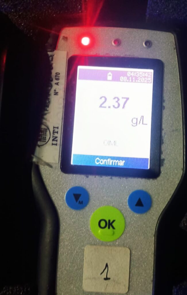 Los efectivos realizaron un control de alcoholemia al conductor, que arrojó 2.37 g/l. Una segunda prueba de U.C.I.M. registró 2.15 g/l, por lo que se dispuso el secuestro del vehículo y su traslado al depósito municipal.