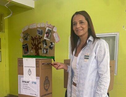 La primera candidata a diputada nacional por San Luis de La Libertad Avanza, Mónica Becerra, emitió su voto minutos antes de las 8:30, en la escuela Doctor Ricardo Rojas, del barrio Villa Celestina de la ciudad de Villa Mercedes.